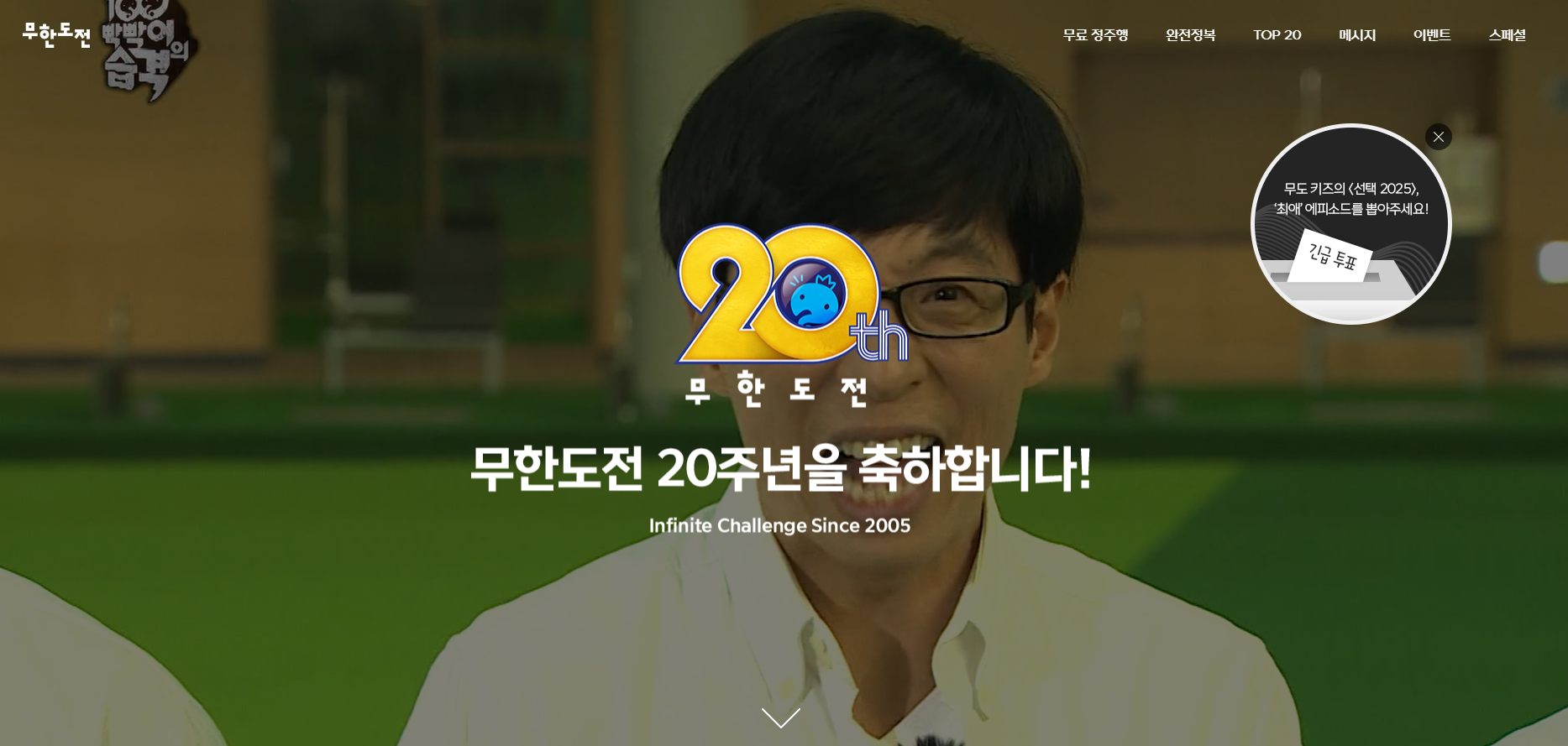 2025년, 대한민국 예능의 전설 <무한도전>이 방송 20주년을 맞이합니다.